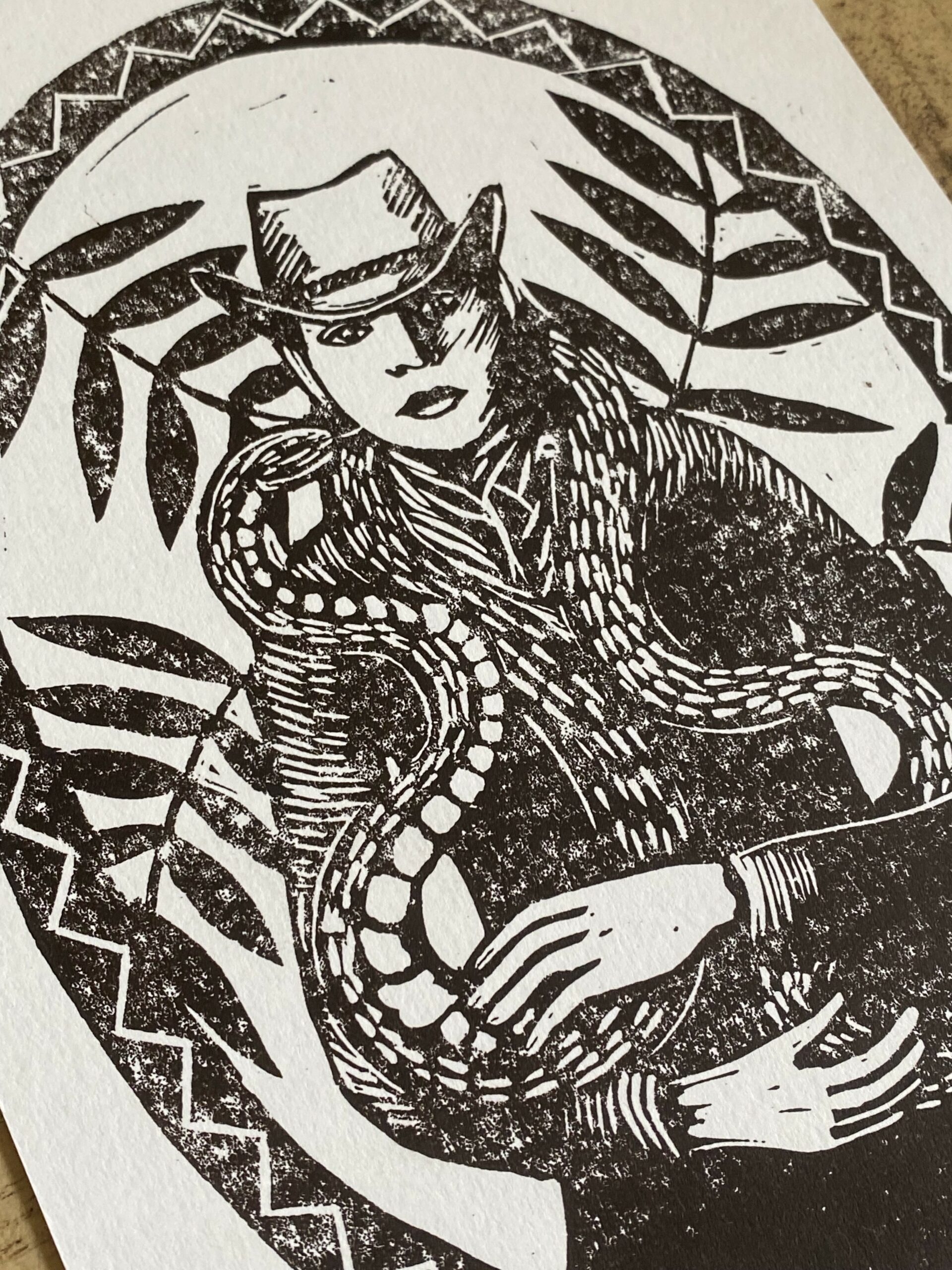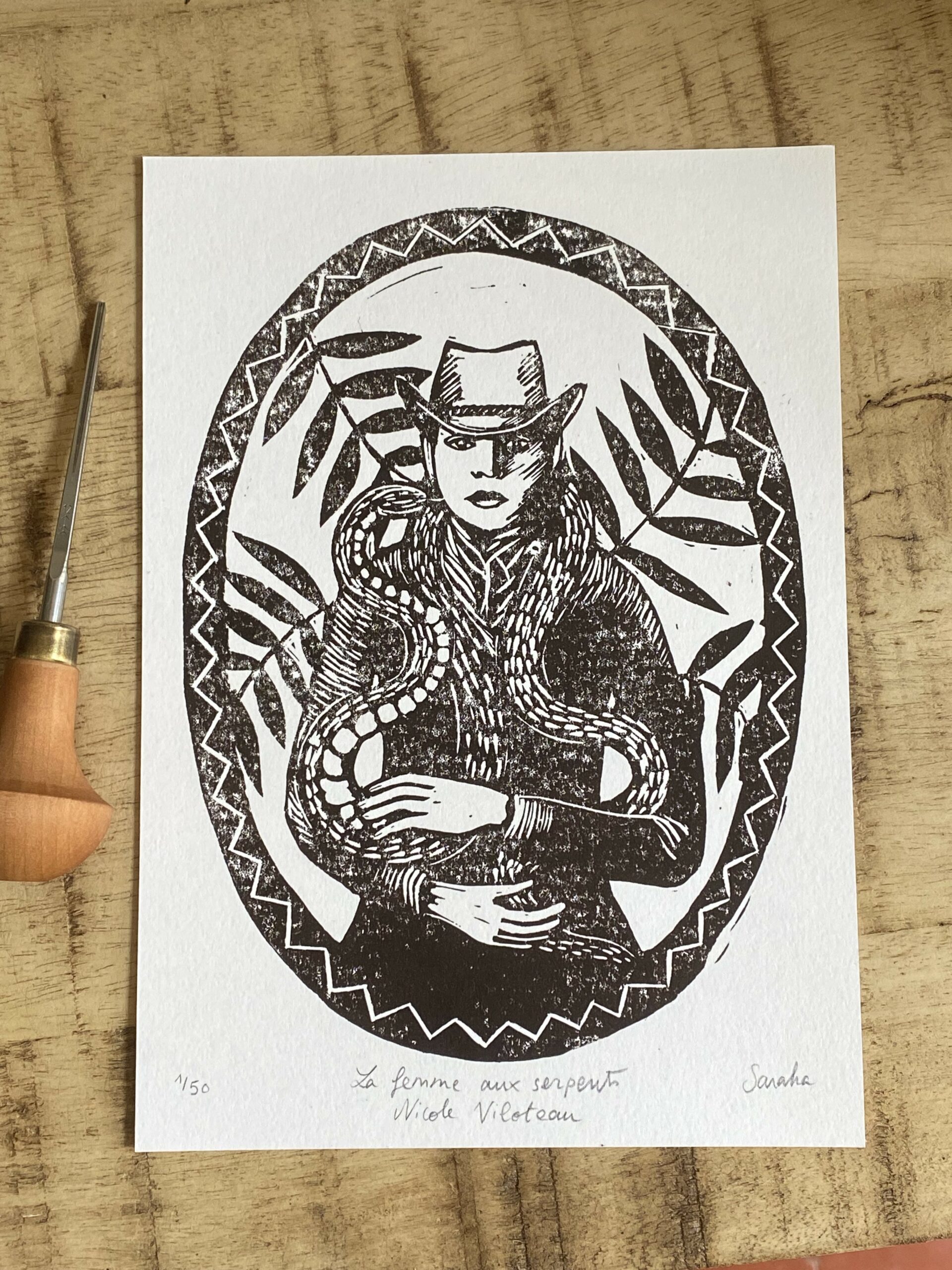 Herpetologue, écrivaine et photographe française, Nicole Viloteau, surnommée la femme aux serpents, a parcouru l’Afrique, l’Amazonie et l’Australie pour observer et apprivoiser les serpents dans leur milieu naturel. Fascinée par son parcours qui mêle l’aventure, le courage et le monde sauvage. Et j’avais très envie de graver une femme aux serpents 🐍